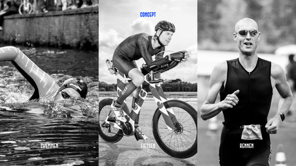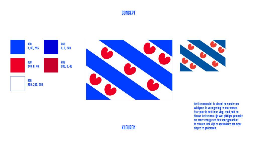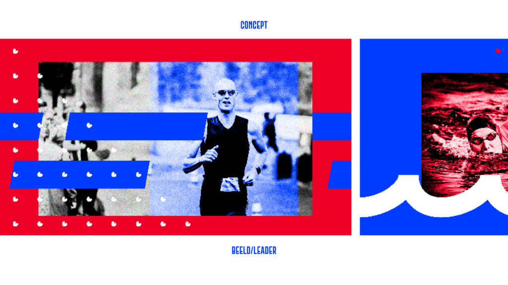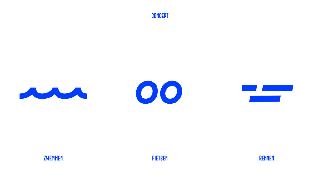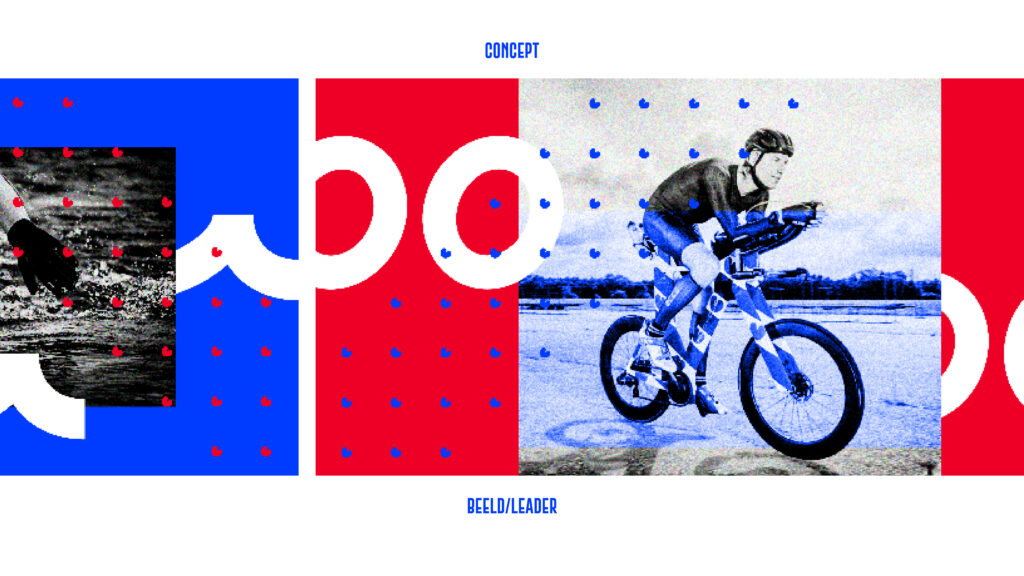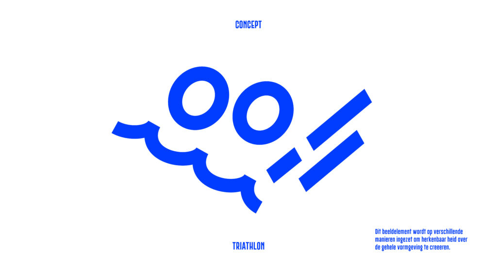 Tijdens het ontwerpen zocht ik naar manieren om de triatlon in 1 beeld te vangen. Dat beeld werd de basis van alle vormgevingselementen die nodig waren om de verschillende uitingen een gezicht te geven. Ook mocht er plaats zijn voor de saamhorigheid die het evenement losmaakte in Nederland en in het bijzonder in Friesland. De kleuren zijn afgeleid van de Friese vlag en de hartjes werden als extra beeldelement ingezet. Zie hieronder de opbouw van het design.